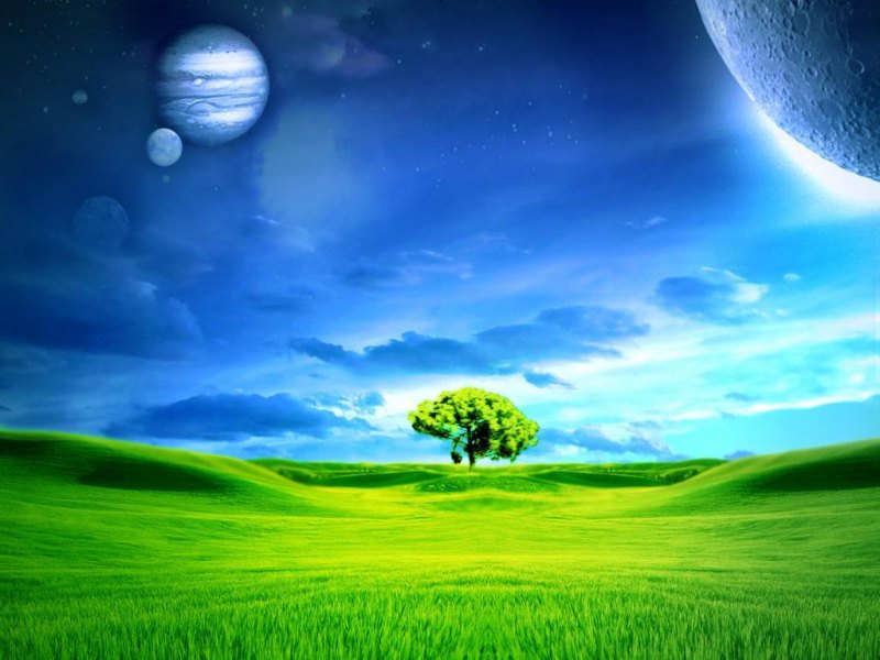a absrtact, depicture of a different world. A calm landscape, with different moons