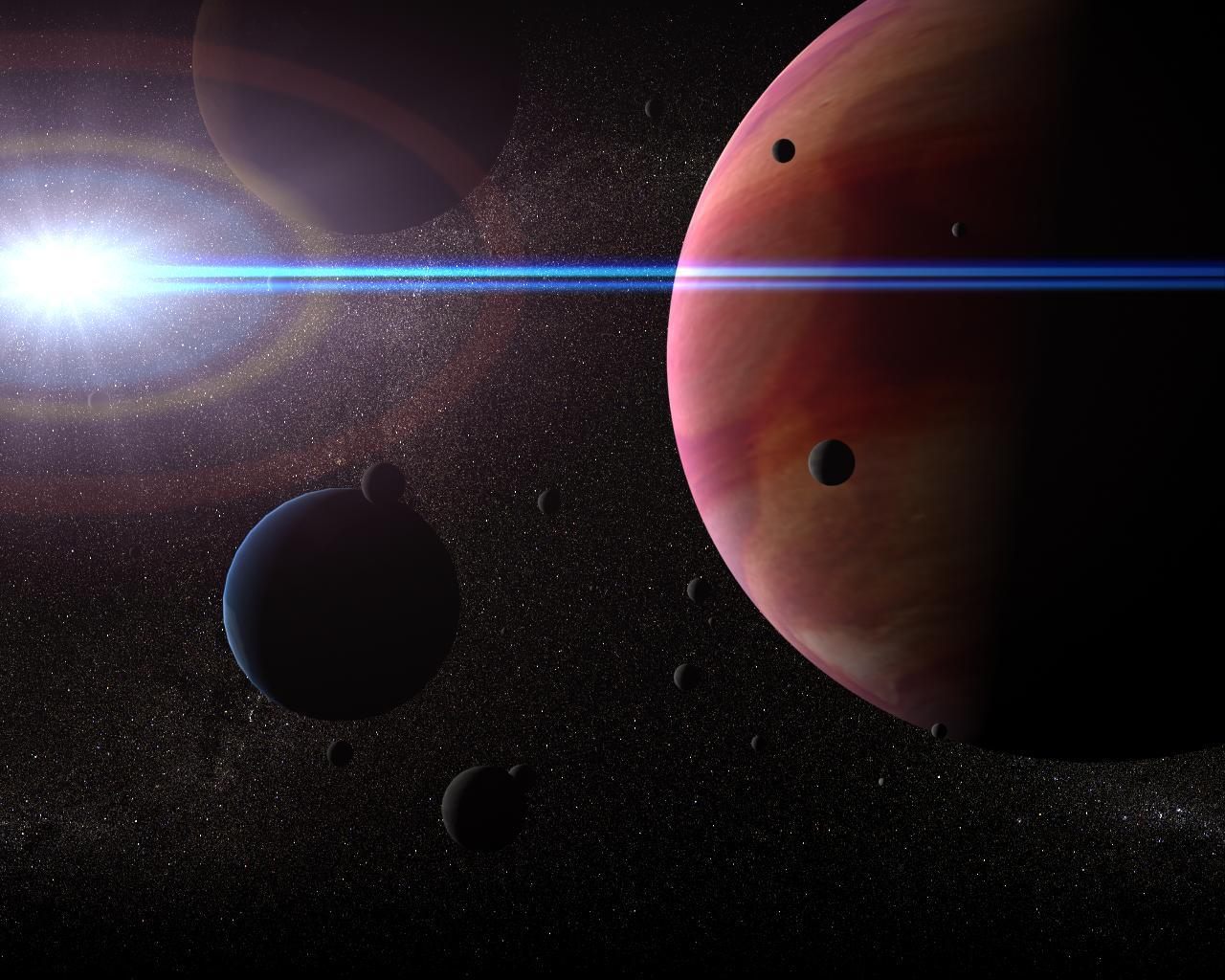 A stunning photorealistic 3D rendered background of the many moons of jupiter brilliantly lit up by the distant sun.